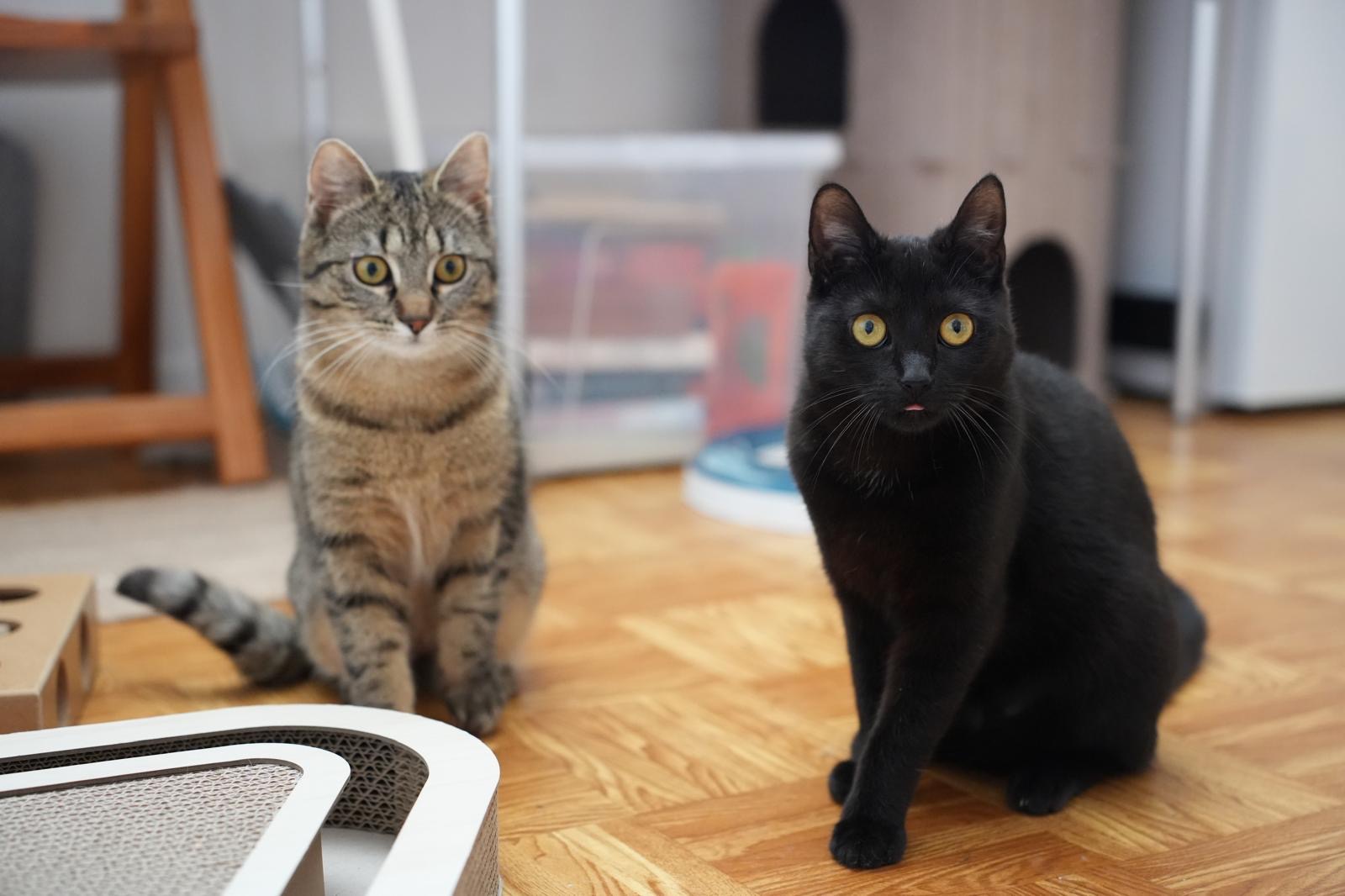 Die beiden ca. 8 Monate alten Katzen haben die ersten Monate in Freiheit verbracht, bevor sie aus einer gefährlichen Umgebung gesichert werden konnten. Anfangs waren sie sehr ängstlich und scheu, die Gewöhnung an Menschen ging nur in sehr kleinen Schritten voran. Mittlerweile tolerieren sie ihre Betreuer, man kann ihnen zusehen, wenn sie spielen und fressen. Und das tun sie reichlich. Trudi, die Getigerte, und Pina, die Schwarze, lassen sich noch nicht anfassen.